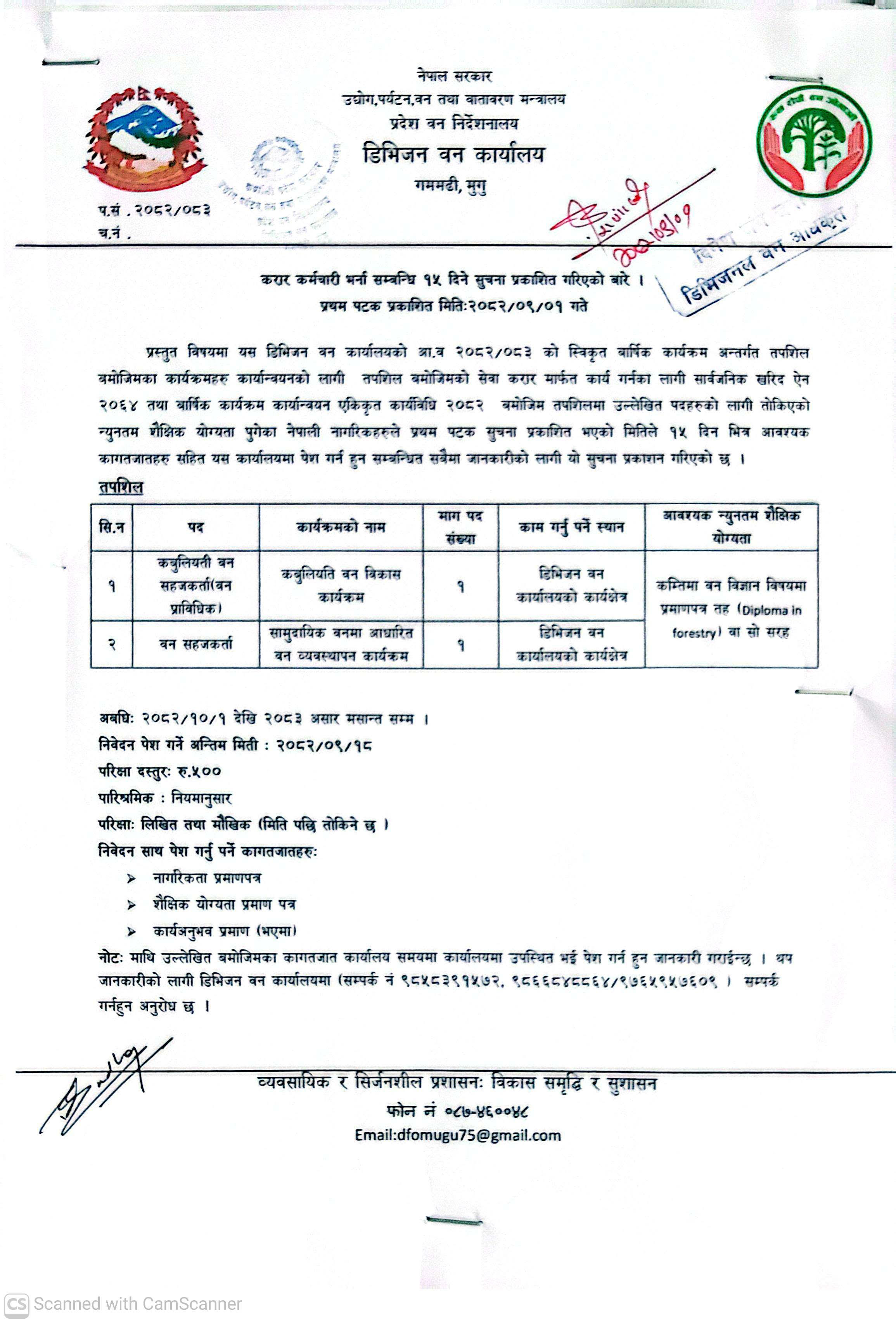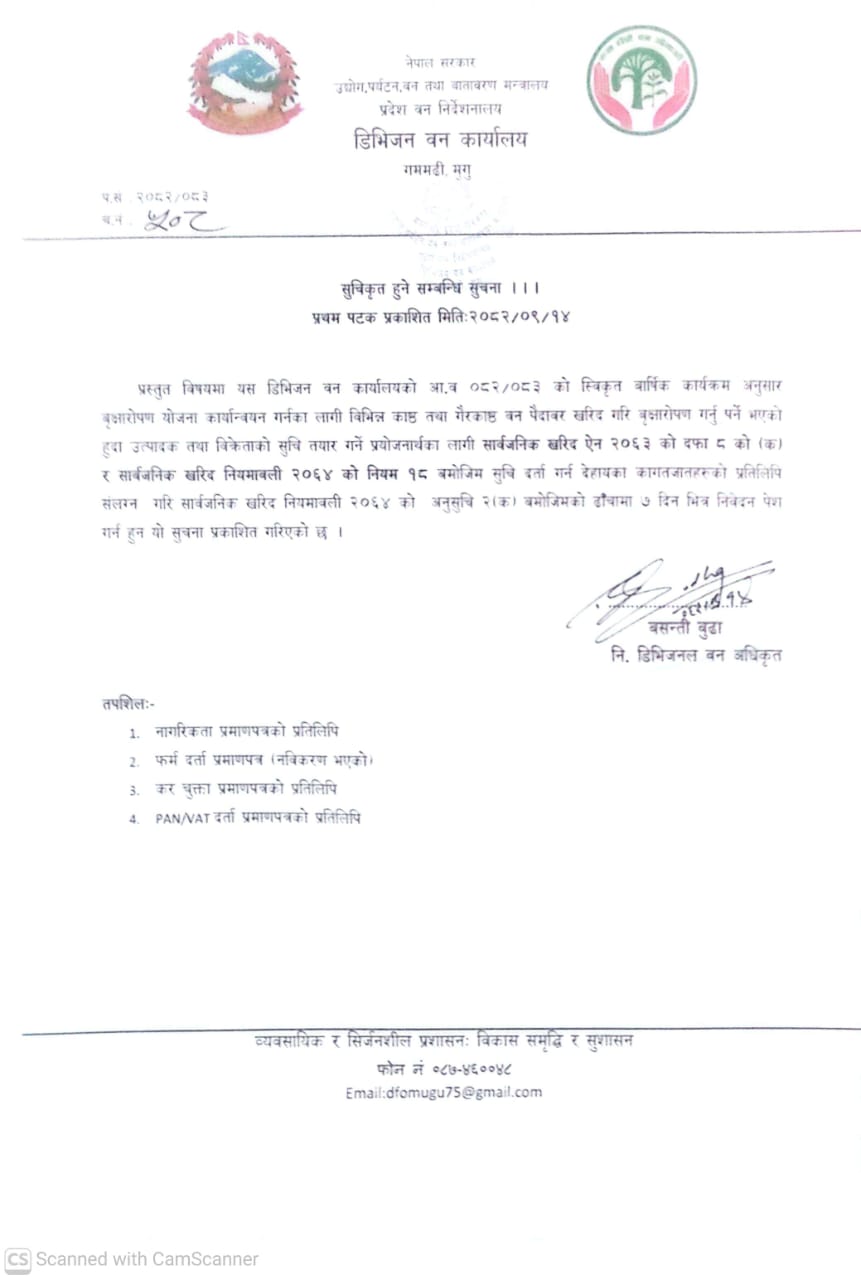 वि.स.२०४० सालमा विकेन्द्रीकरणको भावना र मर्म अनुसार देशभर ५ वटा क्षेत्रिय वन निर्देशनालय तथा ७५ वटै जिल्लामा जिल्ला वन कार्यालयको रुपमा स्थापना गर्ने नीति अनुसार मुगु जिल्लामा जिल्ला वन कार्यालय,मुगुको स्थापना गरियो । बि .स.२०५० सालमा वन विभागको पुनर्गठन अनुरुप मुगु जिल्लामा रा.प.तृतीय श्रेणीको जिल्ला वन अधिकृतको नेतृत्वमा ८ वटा... थप हेर्नुहोस